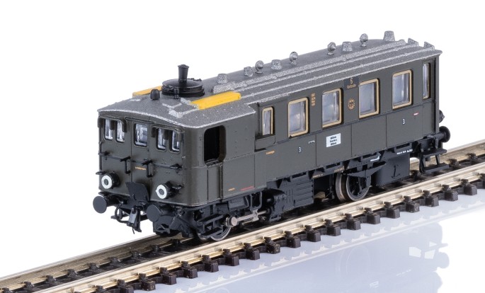 Fein detailliertes Modell des kleinen Dampftriebwagens der Bauart "Kittel" der DRG mit der Bauartbezeichnung Ci dT Wü 05. Das Modell besitzt hinten eine Spur-Z-Systemkupplung und vorne eine vorbildgetreue Nachbildung der Pufferbohle mit Imitat der Schraubenkupplung. Durch die zahlreichen separat angesetzten Teile setzt das kleine Spur-Z Modell ganz eigene Maßstäbe in Sachen Detaillierung.
